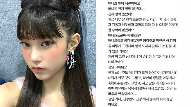 15일 해린은 뉴진스 멤버들이 직접 운영하는 계정을 통해 "버니즈 안녕. 편지 깜짝 놀랐다"는 말로 시작되는 장문의 글을 올렸다.