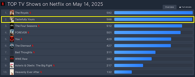 플릭스 패트롤 최신 집계(14일 자) 따르면, 지니 TV 시리즈 '당신의 맛'(극본 정수윤, 연출 박단희)은 '넷플릭스 글로벌 TV 쇼' 부문 2위에 올랐다.