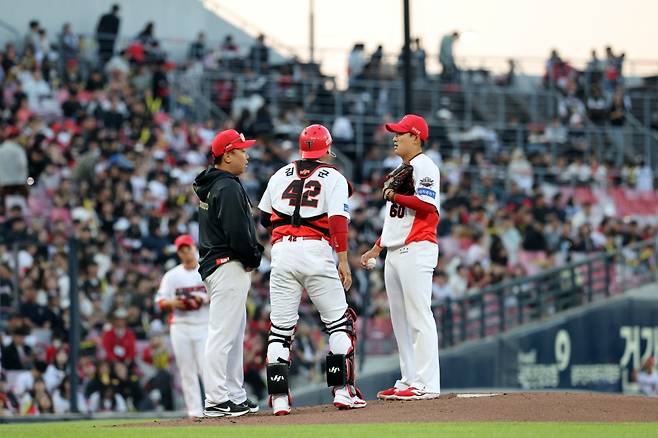 "좀 더 욕심 냈으면 좋겠어" 직접 마운드 올라간 꽃감독, 김도현에게 전한 이야기는… [광주 현장]