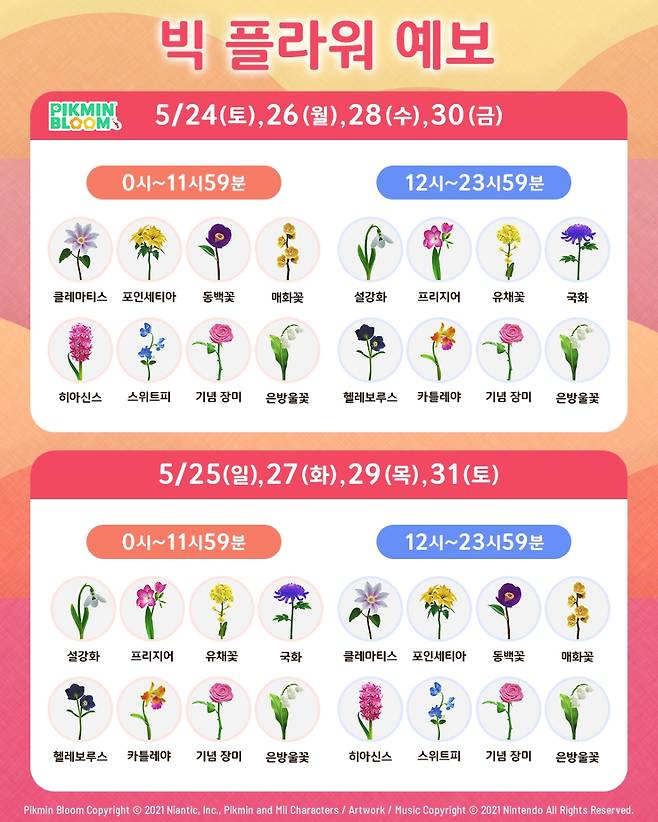 한편, 일반 꽃잎(파랑, 빨강, 노랑, 하양)으로 빅 플라워 주변에 심으면 시즌별 꽃이 만개하게 되는데, 각 꽃마다 만개하는 날짜와 시간이 다르다.