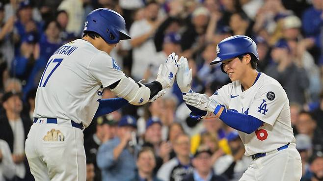 ▲ 홈런을 치고 오타니(왼쪽)와 세리머니 하는 김혜성