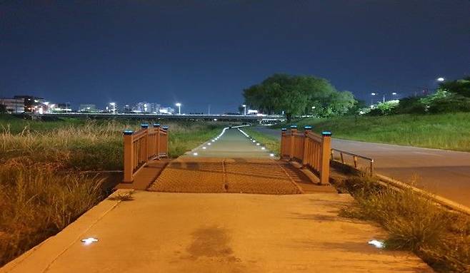 충북 청주시는 시민 보행안전을 위해 무심천 산책로에 태양광 도로표지병을 설치했다고 15일 밝혔다.
