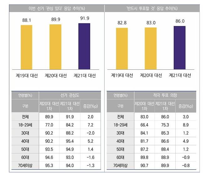 중앙선거관리위원회가 한국갤럽에 의뢰해 전국의 만 18세 이상 유권자 1526명을 대상으로 지난 5월 2일과 3일 전화면접(CATI)방식으로 실시한 유권자 의식조사(표본오차는 95% 신뢰수준에서 ±2.5%포인트) 결과 ‘반드시 투표할 것’이라고 응답한 비율은 86.0%로 조사됐다. ‘가능하면 투표할 생각’이라고 응답한 사람은 10.8%로 나타났다. 연령대별 적극적 투표 참여 응답자는 18~29세 이하 75.3%, 30대 85.3%, 40대 86.6%, 50대 88.4%, 60대 88.9%, 70대 이상 89.9%인 것으로 나타났다.