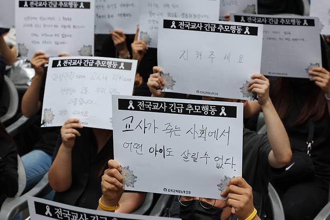 | ▲ 2023년 7월 22일 당시 서울 서초구의 한 초등학교에서 발생한 교사 사망 사건과 관련해 전국교직원노동조합 조합원들이 서울 종로구 청계천 광통교 인근에서 열린 전국교사 긴급추모행동에서 구호를 외치고 있다. |