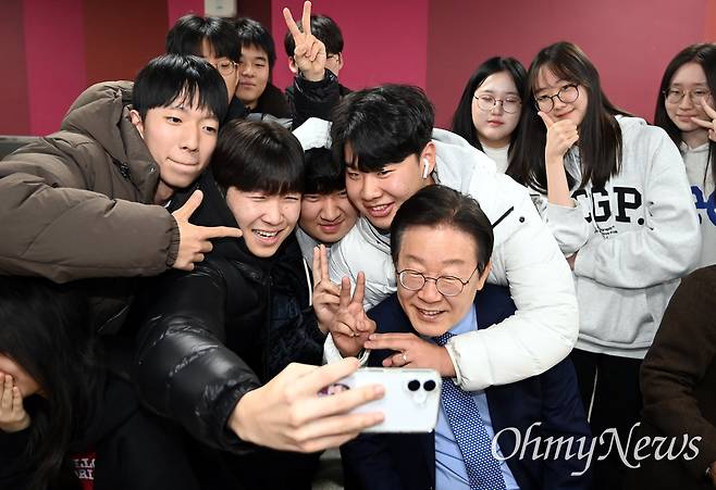 | ▲ 지난 2024년 11월 27일 당시 이재명 더불어민주당 대표가 서울 성동구 금호고등학교에서 열린 '고교 무상교육을 위한 현장 간담회'를 마치고 식생활 교육실에서 학생들과 사진을 찍고 있는 모습. |