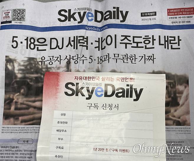 | ▲ 2025년 2월 22일자 <스카이데일리> 5·18특별판 1면. 발행 일자보다 1주일 앞선 2월 15일 윤석열 탄핵 찬·반 집회가 열린 광주 금남로에서 배포됐다. 40쪽짜리 인쇄물엔 5·18 왜곡·폄훼 기사가 빼곡히 담겨 있다. |