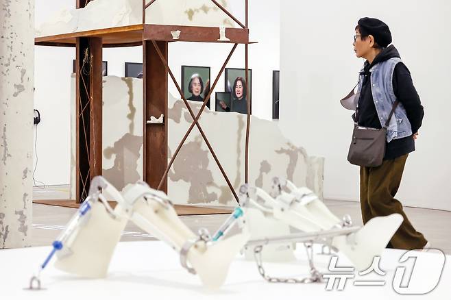 (서울=뉴스1) 민경석 기자 = 15일 서울 종로구 국립현대미술관에서 열린 '기울인 몸들: 서로의 취약함이 만날 때' 전시 언론공개회에서 취재진이 작품을 살펴보고 있다.