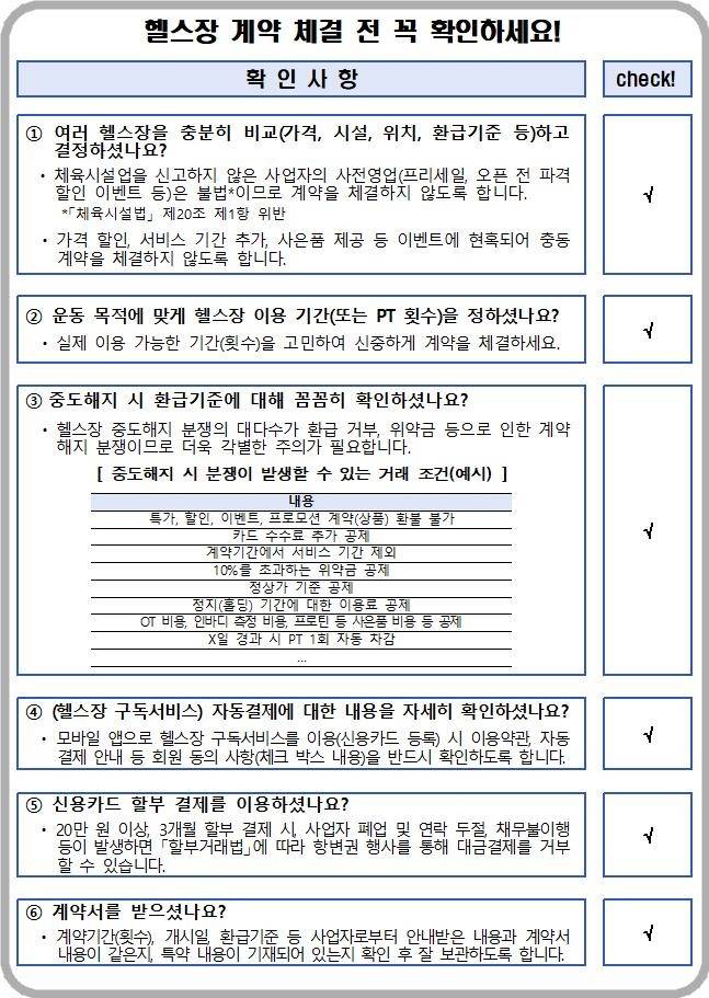| ▲ 한국소비자원은 15일 헬스장 계약 체결 전 확인해야 할 '체크리스트'를 공개했다. |
