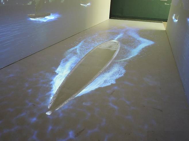 | ▲ '오세아니아 카누'를 미디어아트로 재구성해 전시장 입구에 설치했다. 마치 관객이 물속에 빠진 듯한 착각이 들게 한다 |