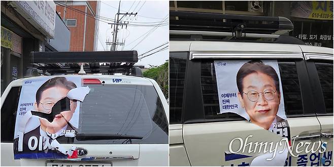 | ▲ 15일 오전 대구 남구 대명동에 세워져 있던 이재명 더불어민주당 대선 후보의 선거운동원 차량에 붙어 있던 포스터가 누군가에 의해 찢어져 있다. |