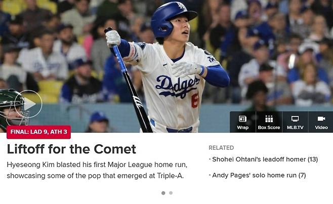| ▲ 김혜성의 메이저리그 첫 홈런을 알리는 로스앤젤레스 다저스 구단 홈페이지 |