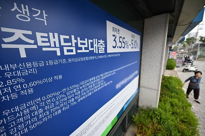 주택담보대출 연체율이 두 달 연속 최고치를 경신하고 있는 15일 서울 성동구에 있는 한 은행에 주택담보대출 상품 현수막이 걸려있다.