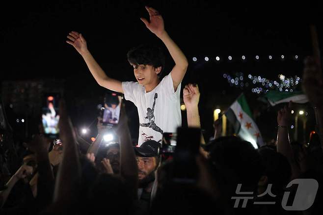 (다마스쿠스 AFP=뉴스1) 권영미 기자 = 도널드 트럼프 미국 대통령이 13일(현지시간) 시리아에 대한 제재를 모두 해제하자 시리아 다마스쿠스의 오메이야드 광장에 시리아인들이 모여들어 기뻐하고 있다. 2025.05.13.