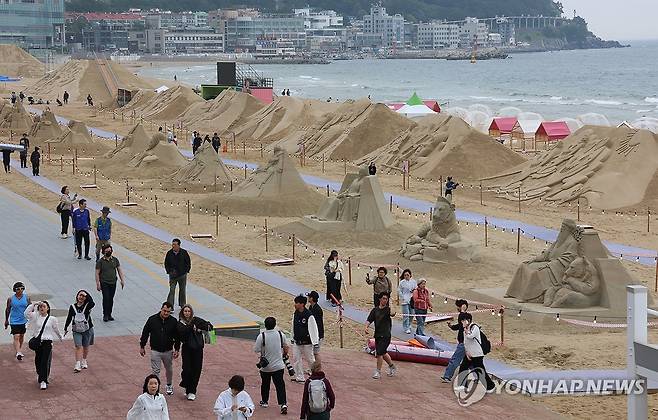 (부산=연합뉴스) 강선배 기자 = '2025년 해운대 모래축제' 개막을 하루 앞둔 15일 오후 부산 해운대해수욕장을 찾은 시민과 관광객들이 다양한 모래조각 작품을 살펴보고 있다.