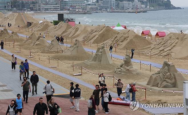 (부산=연합뉴스) 강선배 기자 = '2025년 해운대 모래축제' 개막을 하루 앞둔 15일 오후 부산 해운대해수욕장을 찾은 시민과 관광객들이 다양한 모래조각 작품을 살펴보고 있다.