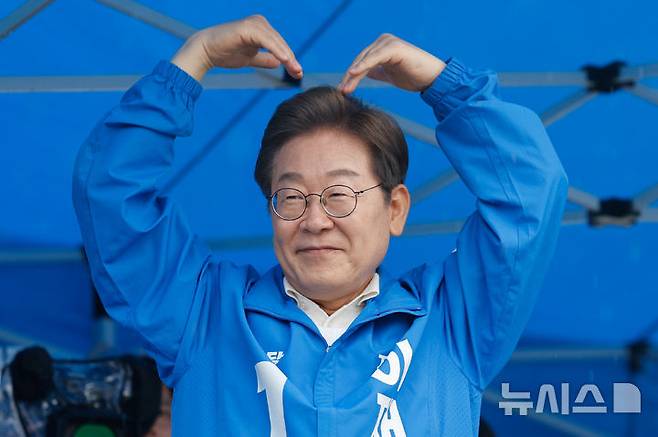 [여수=뉴시스] 권창회 기자 = 이재명 더불어민주당 대선 후보가 15일 전남 여수시 이순신광장에서 열린 집중유세에서 연설을 마친 뒤 시민들에게 하트를 그려 보이고 있다. (공동취재) 2025.05.15. photo@newsis.com