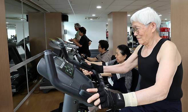 15일 서울 성북구 석관동 석관실버복지센터에서 본격 운영을 시작한 노인 맞춤형 헬스장을 찾은 구내 어르신들이 기구를 이용해 운동을 하고 있다.