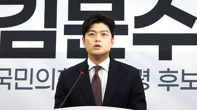 ▲ 국민의힘 비상대책위원장으로 임명된 김용태 의원이 15일 국회에서 기자회견을 열고 발언하고 있다.