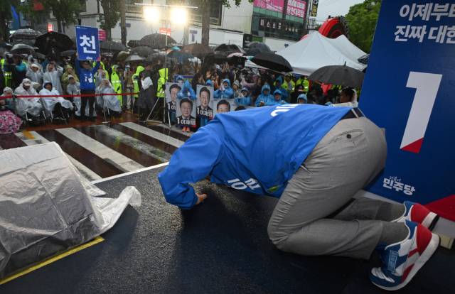 이재명 더불어민주당 대선 후보가 15일 쏟아지는 비에도 불구하고 수많은 인파가 운집한 전남 순천시 연향동 패션의거리에서 유세를 마친 뒤 빗속에서 본인의 연설을 들어준 지지자들을 향해 큰절하고 있다. 순천=오승현 기자 2025.05.15