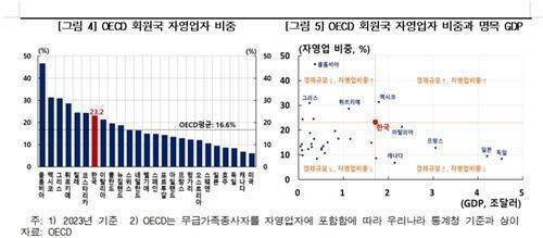 보고서에 따르면 경제협력개발기구(OECD)의 2023년 통계상 우리나라의 자영업자(무급 가족종사자 포함 기준) 비중은 23.2%로 OECD 국가들 가운데 7위일 뿐 아니라 평균(16.6%)을 크게 웃돕니다.