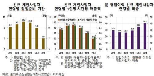 소상공인 실태조사(2022년 기준)를 봐도 60대의 평균 창업 준비 기간은 9개월에 불과하고, 1인당 매출액(연간매출액/종사자 수)도 3천만 원에 그쳐 20∼50대의 생산성을 크게 밑돌았습니다.