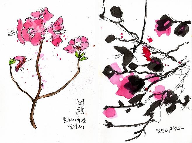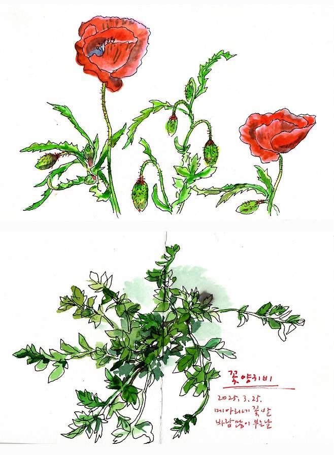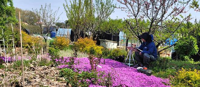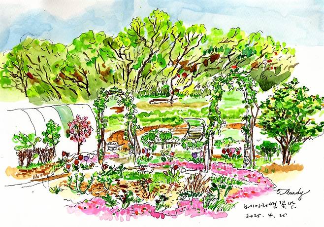 기사에 쓸 꽃밭 전경을 그리기 위해 다시 꽃밭을 찾았다. 울타리를 이루던 조팝나무와 벚나무는 이미 꽃이 지고 있었다. 대신 핑크색 패랭이꽃이 만개했고, 노란 수선화와 온갖 색의 튤립이 피어나고 있었다.