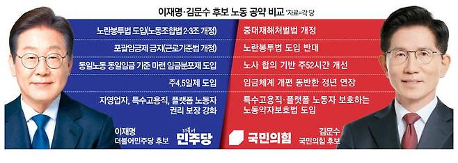 10대 시절 '소년공' 생활을 한 이재명 더불어민주당 대선후보와 1980년대 거물급 '노동운동가'였던 김문수 국민의힘 후보는 나란히 노동 경력을 앞세우지만 노동 공약에서는 극과 극으로 대조를 이룬다.