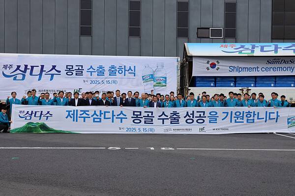 제주특별자치도개발공사(사장 백경훈)는 15일 조천읍 교래리에 위치한 제주삼다수 공장에서 제주삼다수 몽골 수출을 위한 출하식 행사를 진행했다.