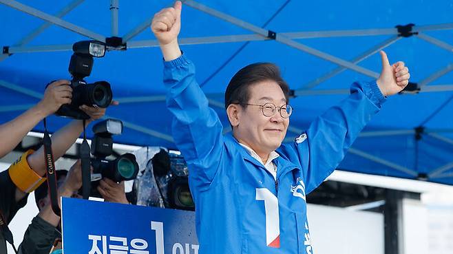 ▲ 더불어민주당 이재명 대선 후보가 15일 전남 여수시 이순신 광장에서 열린 집중 유세에서 연설을 마친 후 시민들을 향해 인사하고 있다.