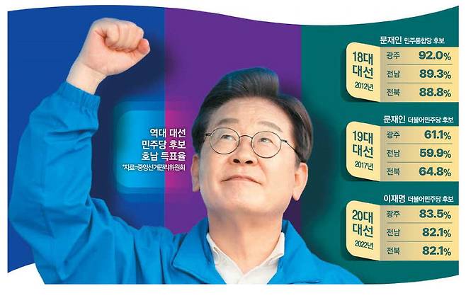 민주당은 이번 대선에서 호남 득표율 목표를 90% 이상으로 설정하고 공을 들이고 있다. 2022년 치러진 제20대 대선에서 이 후보가 80% 중반대 득표율에 그친 것을 패배의 원인 중 하나로 인식하는 모습이다. 전남의 한 민주당 의원은 "명시적으로 정해진 것은 없지만, 우리 후보 외 나머지 후보들 득표율의 합이 두 자릿수(10%)를 넘지 않도록 하는 게 목표"라며 "이번 선거에서 득표율이 지역 관리에 대한 평가지표가 될 것"이라고 말했다.
