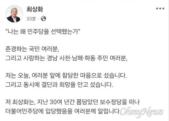 최상화 소장은 "사랑하는 사천·남해·하동 주민 여러분, 저는 오늘, 여러분 앞에 참담한 마음으로 섰습니다. 동시에 결단과 희망을 안고 섰습니다"라며 "지난 30여년간 몸 담았던 보수정당을 떠나 더불어민주당에 입당했음을 여러분께 알립니다"라고 했다.