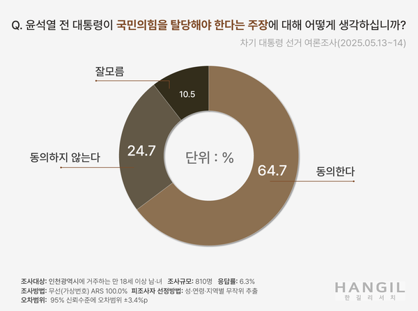 경인방송과 인천일보 공동 의뢰로 여론조사 전문기관 한길리서치가 지난 13~14일 이틀간 인천시에 거주하는 만 18세 이상 남녀 810명을 대상으로 조사한 결과, '윤석열 전 대통령이 국민의힘을 탈당해야 한다'는 주장에 대해 응답자의 64.7%가 '동의한다'고 답했습니다.