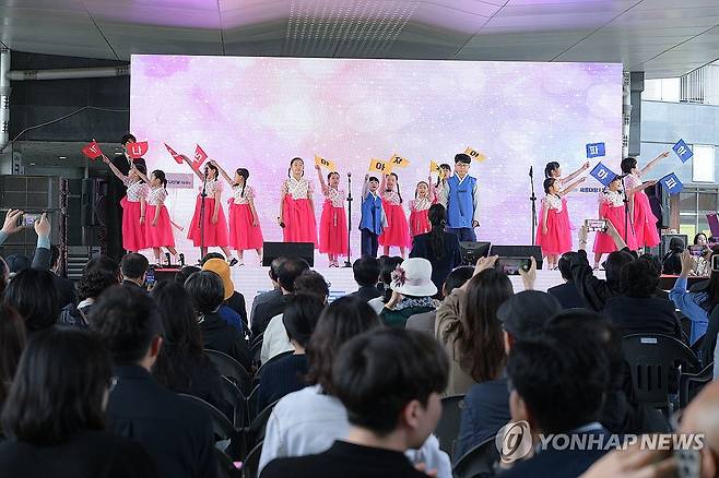 (세종=연합뉴스) 15일 세종시 한솔동 한글사랑거리에서 열린 제628돌 세종대왕 나신 날 기념식에서 축하공연이 이어지고 있다.