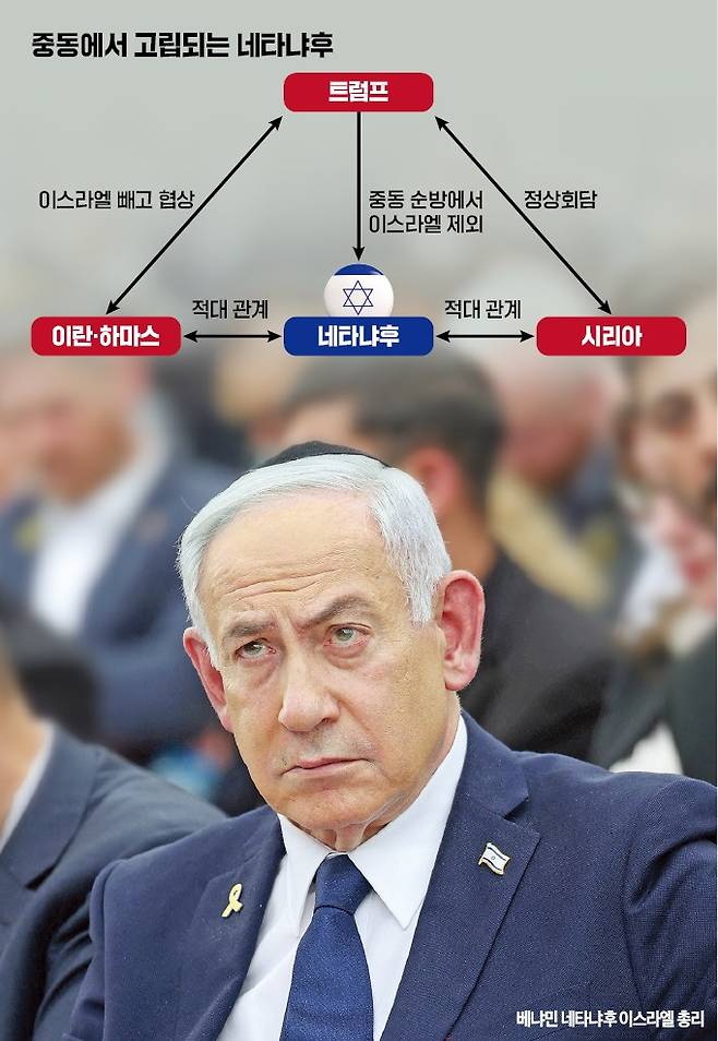 베냐민 네타냐후 이스라엘 총리와 도널드 트럼프 미국 대통령의 ‘브로맨스’에 균열이 뚜렷해지고 있다. 트럼프 대통령이 집권 2기 첫 순방지로 중동을 택하면서도 이스라엘을 제외한 데다 이스라엘과 적대 관계인 시리아와 예정에 없던 정상회담을 하는 등 ‘이스라엘 패싱’ 움직임을 보이면서다.