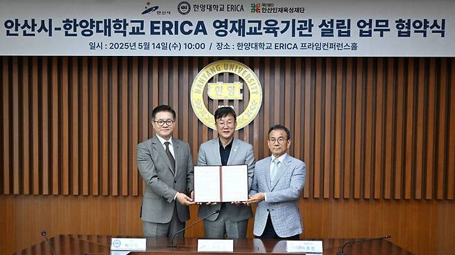 경기도 안산시는 지난 14일 한양대 에리카 콘퍼런스홀에서 안산인재육성재단, 한양대 에리카와 '영재교육기관 설립을 위한 업무협약'을 체결했다고 15일 밝혔습니다.