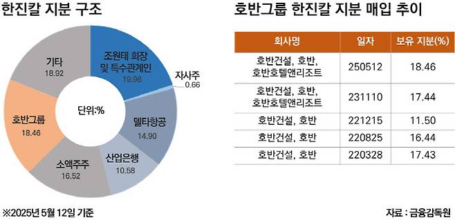 한편 한진칼 주가는 지난 13일과 14일 이틀 연속 상한가를 기록한 뒤 이날 KRX 정규장에서 전일대비 17.00%(2만5600원) 급락한 12만5000원에 거래를 마쳤다. 호반 측이 2024년 3월부터 지난 12일까지 84회에 걸쳐 사들인 평균 주가는 주당 7만787원으로, 급락한 이날 종가 기준으로도 이미 76%가 넘는 수익률이 기대된다.