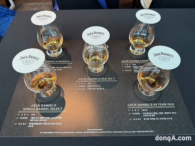 시음회는 잭 다니엘스 고급화 라인업을 소개하는 자리였다. 대중들에게 잘 알려진 ▲잭 다니엘스 올드넘버 7을 비롯해 ▲잭 다니엘스 본디드 ▲잭 다니엘스 본디드 라이 ▲잭 다니엘스 싱글배럴 ▲잭 다니엘스 10년 등 5종 시음이 진행됐다.