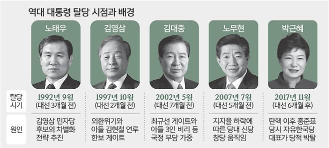 노태우 전 대통령은 대선을 3개월 앞둔 1992년 9월 당시 김영삼 민주자유당 대선후보의 차별화 시도에 발끈해 명예총재직을 던지고 탈당했다. 김영삼 대통령도 15대 대선을 두 달 앞둔 1997년 10월 당적을 버렸다. 외환위기에 더해 아들 김현철씨까지 한보 게이트와 뇌물수수 혐의로 체포되며 인기가 바닥을 치자 당시 차기 대선주자이던 이회창 신한국당 총재가 탈당을 요구했기 때문이다.