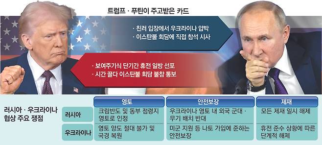 도널드 트럼프 미국 대통령도 해당 회담 참석을 운운하면서 열기를 띄웠지만, 푸틴 대통령은 여기에 놀아나지 않았다. 미국을 비롯한 서방의 지원 없이 전쟁 수행이 불가능한 우크라이나를 상대로 전황에서 우위를 보이는 러시아는 국제사회 압박에 동요할 필요가 없기 때문이다. 미국·러시아 정상이 우크라이나 미래를 건 ‘카드 게임’에서 푸틴 대통령이 트럼프 대통령의 기세를 꺾은 셈이다.