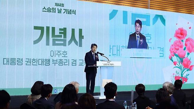 ▲ 이주호 대통령 권한대행 부총리 겸 교육부 장관이 15일 서울 여의도 FKI 타워에서 열린 제44회 스승의 날 기념식에 기념사를 하고 있다.