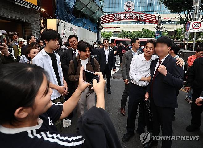 (서울=연합뉴스) 김인철 기자 = 개혁신당 이준석 대선 후보가 15일 서울 광진구 건대맛의거리에서 도보 유세를 하며 시민들과 기념촬영을 하고 있다. 2025.5.15