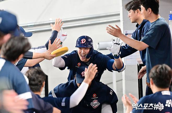 (엑스포츠뉴스 대전, 김한준 기자) 15일 오후 대전 한화생명 볼파크에서 열린 '2025 신한 SOL Bank KBO리그' 두산 베어스와 한화 이글스의 경기, 3회초 두산 양석환이 솔로 홈런을 날린 후 박석민 코치 등에 업혀 기뻐하고 있다.