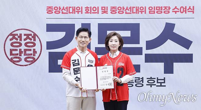 | ▲ 김문수 국민의힘 대선후보(왼쪽)가 지난 12일 서울 여의도 국민의힘 중앙당사에서 열린 중앙선거대책위원회 임명장 수여식에서 나경원 공동선대위원장에게 임명장 전달 후 기념촬영을 하고 있다. |