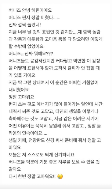 해린은 "지금 너무 날 것의 표현인 것 같지만 제 깜짝 놀람과 감동과 애틋함과 고마움 등을 다 담으려면 이렇게 할 수밖에 없었다"고 말했다.