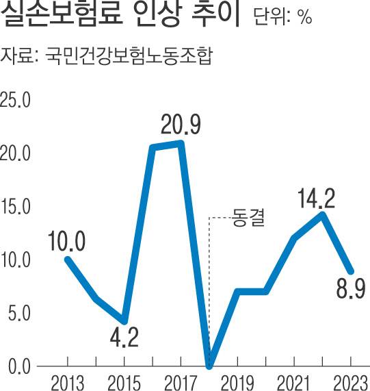 국민건강보험노조는 15일 “60%대 초반인 공적 건강보험 제도의 낮은 보장률을 보완하고자 허용한 실손보험이 결과적으로 국민 의료비 부담을 키우고 공적 보험의 재정 손실을 야기하는 기형적 상품이 되고 말았다”고 했다. 노조가 분석한 결과를 보면 실손보험료는 2013~2023년 연평균 10.2%씩 올랐다.