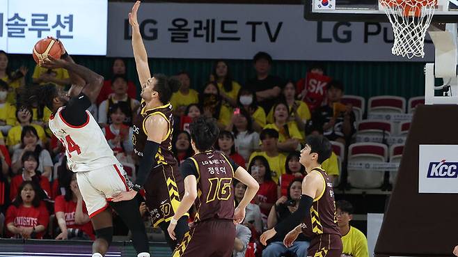 ▲ 15일 경남 창원체육관에서 열린 2024∼2025시즌 프로농구 창원 LG 세이커스와 서울 SK 나이츠의 챔피언결정전 6차전 경기. SK 자밀 워니가 슛하고 있다.