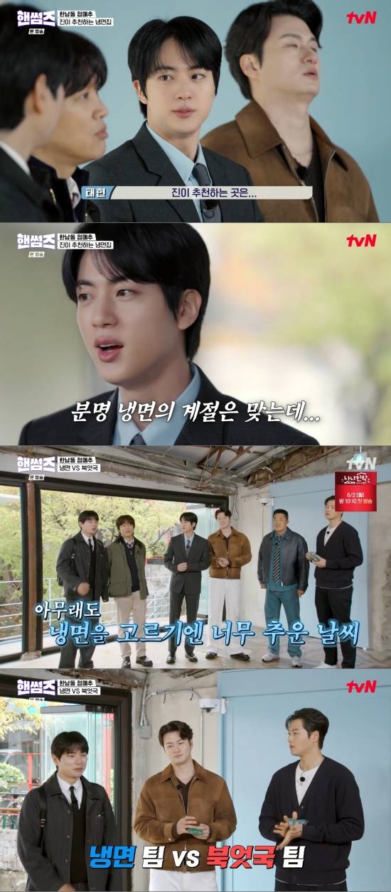 그러나 멤버들은 추운 날씨 탓에 냉면을 부담스러워했고, 진은 "원래 냉면 먹는 게 맞다, 이 시기에는. 근데 입김이 나온다. 온육수 있다"라며 귀띔했다.
