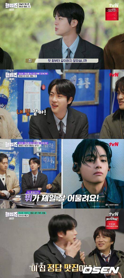 15일 방송된 tvN '핸썸가이즈'에는 차태현, 김동현, 이이경, 신승호, 오상욱과 함께 일일 게스트 방탄소년단 진이 출연해 서울 한남동 지역의 점메추(점심 메뉴 추천) & 저메추(저녁 메뉴 추천) 원정에 나선다.