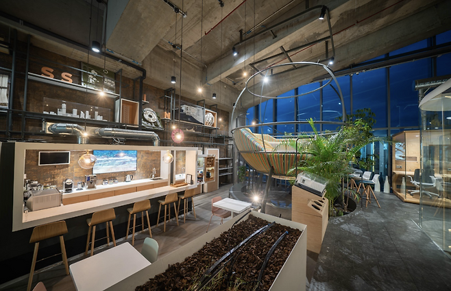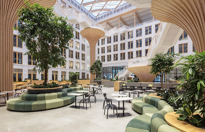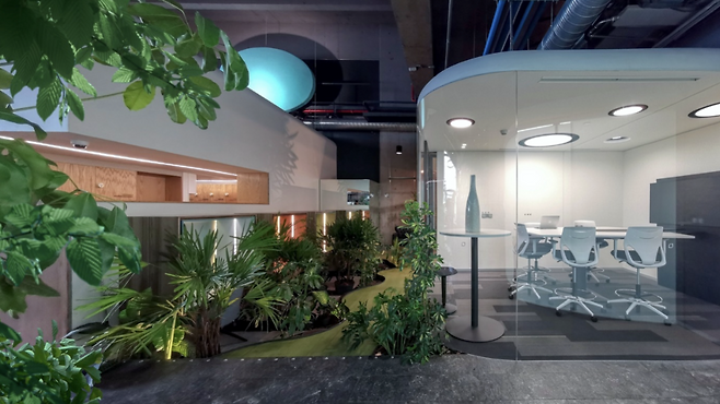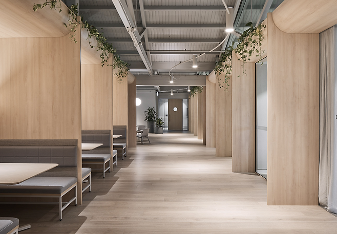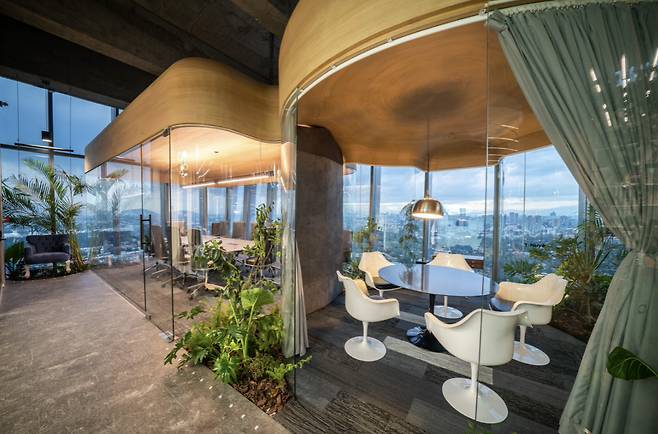 사무실 내부는 개방적이면서도 개인의 집중력을 유지할 수 있도록 설계되었습니다. 매일 새로운 자리를 선택할 수 있도록 지원하는 유연한 공간 운영으로 다양한 자리에서의 새로운 경험들이 공간을 사용하는 사용자들에게 신선함과 동기를 제공합니다. 내부에 조성된 작은 생태계는 공기의 질을 높이는 역할을 합니다. CO2와 포름알데히드를 흡수하는 식물을 활용해 공기 중 유해 물질을 줄이고, 쾌적한 환경을 유지합니다. 이러한 설계를 통해 이 사무실은 일반적인 기업 공간에서는 보기 어려운 수준으로 깨끗한 공기질을 유지하고 있습니다.