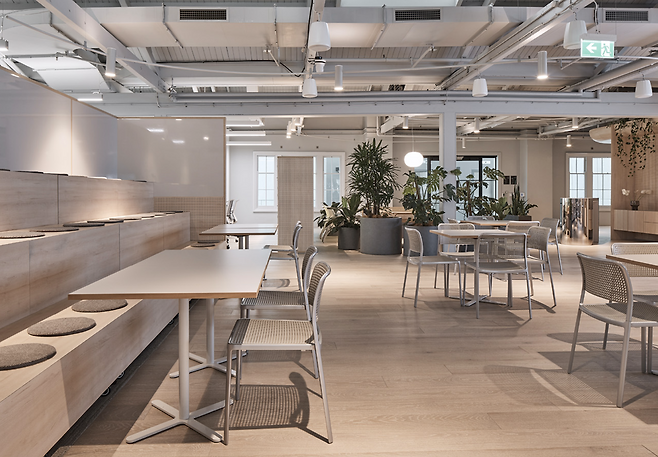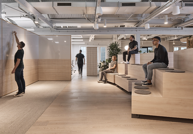 협업 공간에는 디지털 기술이 적용된 작업 도구뿐 아니라 화이트보드 벽이 있어 브레인스토밍이나 워크숍에 적합하며, 이동식 가구는 사용자의 필요에 따라 공간을 자유롭게 조정할 수 있습니다. 그리고 복도 곳곳에 배치된 느슨한 가구는 방문객과 직원들이 자연스럽게 모일 수 있는 즉흥적인 회의 공간을 제공합니다.